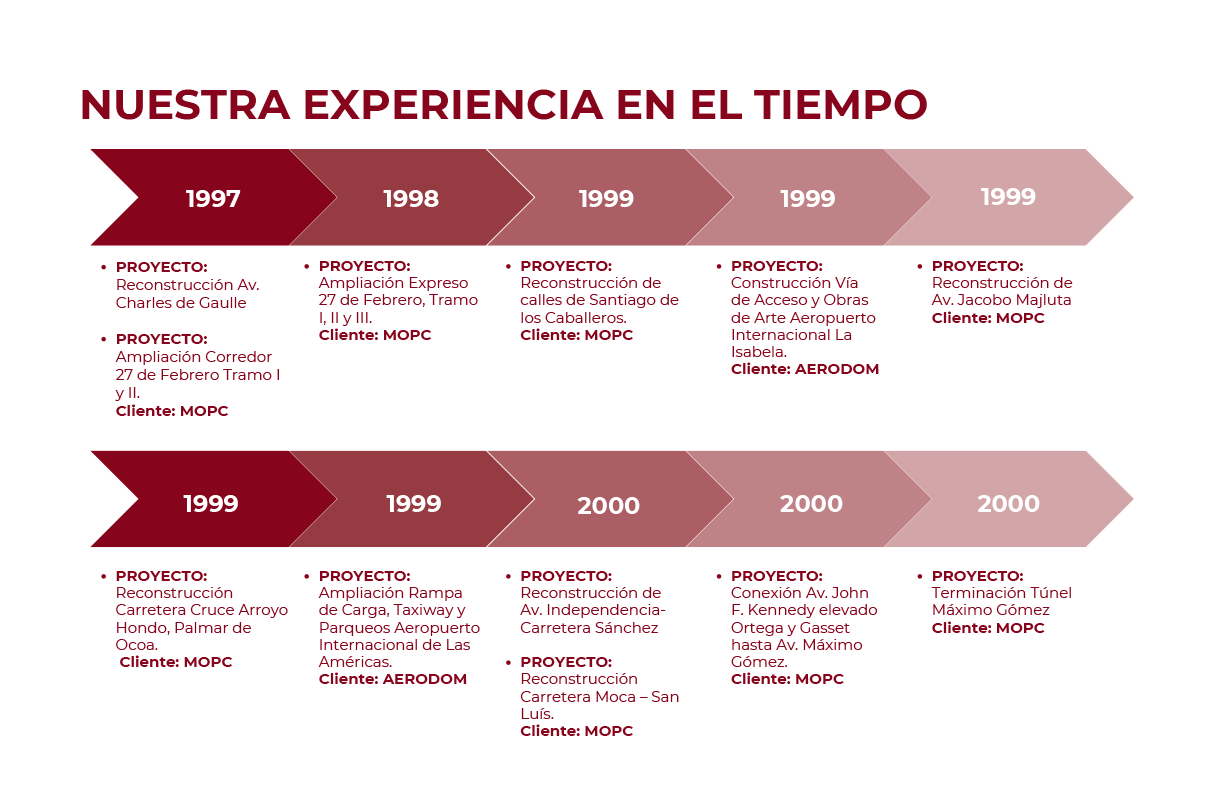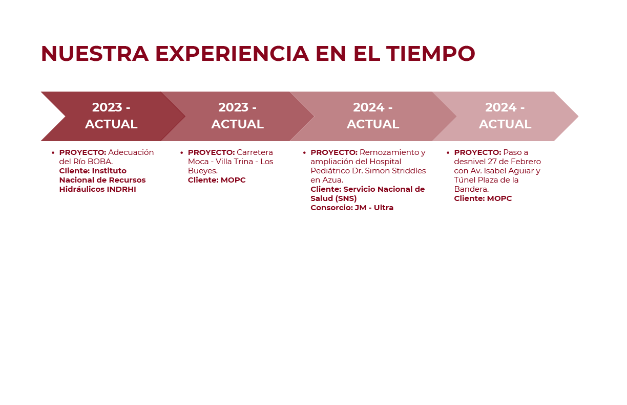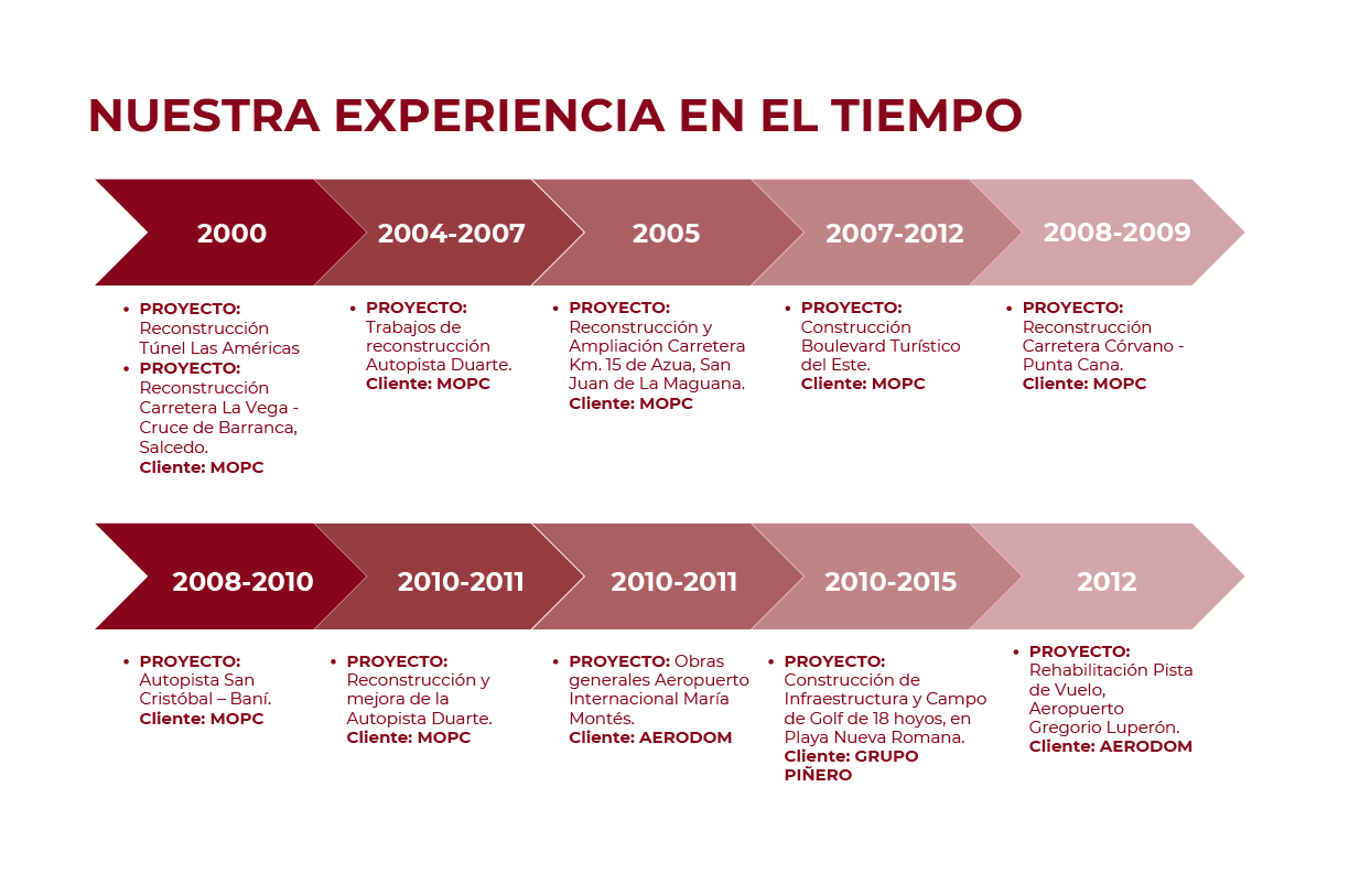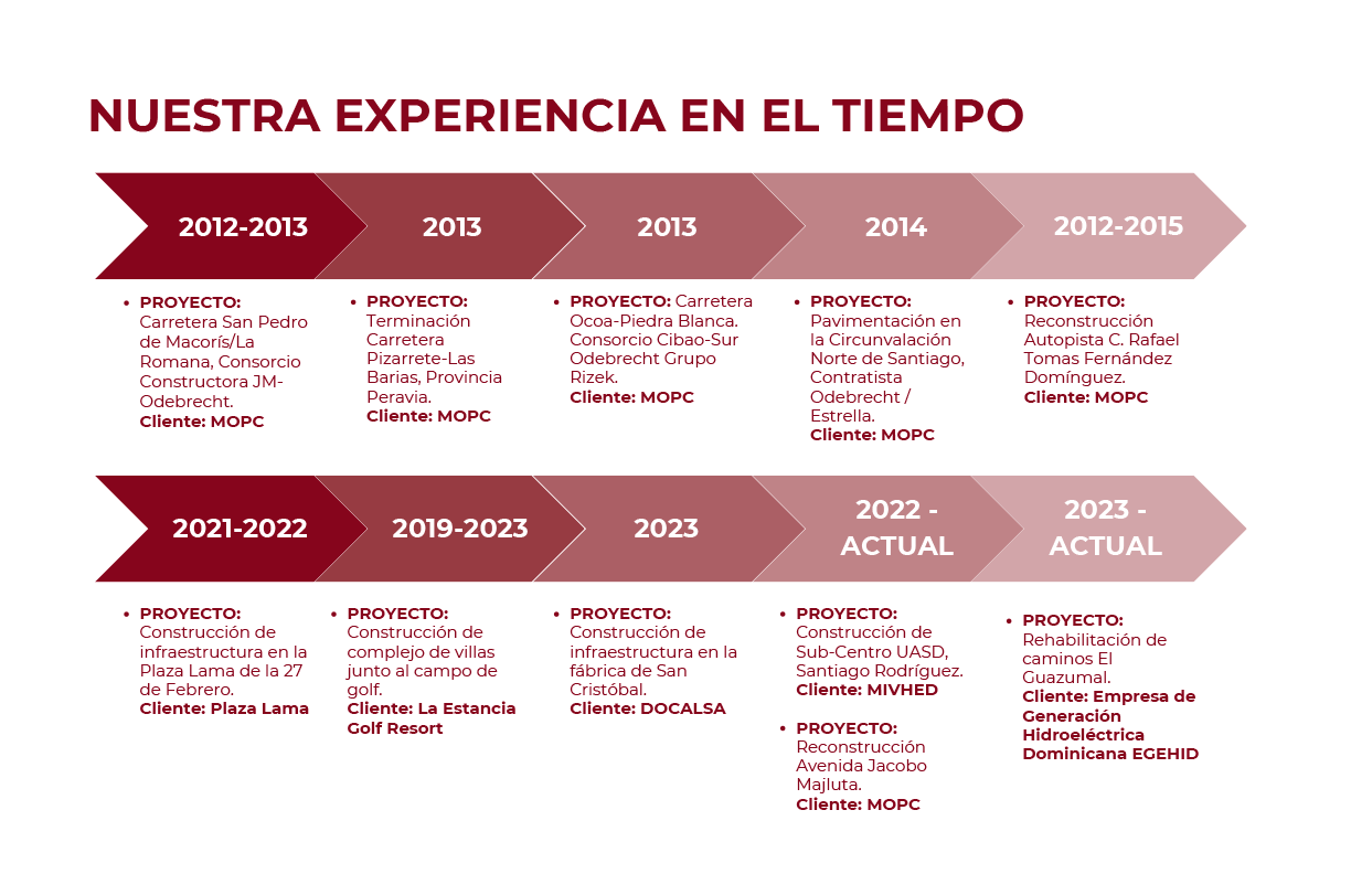 A lo largo de su trayectoria, Constructora JM ha tenido el privilegio de desarrollar proyectos emblemáticos para clientes de renombre, consolidando nuestra reputación en el sector de la construcción. Hemos colaborado estrechamente con el Ministerio de Obras Públicas y Comunicaciones (MOPC) en la reconstrucción de la Avenida Jacobo Majluta, así como en el mejoramiento de la infraestructura vial Norte-Sur en Santo Domingo. Con AERODOM, participamos en la rehabilitación de la pista de vuelo del Aeropuerto Gregorio Luperón y la construcción de la pista y taxiway del Aeropuerto Internacional María Montés. Asimismo, trabajamos con el GRUPO PIÑERO en la construcción de las infraestructuras y del campo de golf de 18 hoyos en Playa Nueva Romana. Nuestra colaboración con la Empresa de Generación Hidroeléctrica Dominicana (EGEHID) nos permitió Rehabilitar caminos, favoreciendo a miles de dominicanos que viven en áreas de difícil acceso y para facilitar el acceso de la generación eléctrica. Con el Instituto Nacional de Recursos Hidráulicos (INDRHI), trabajamos en la readecuación del Río Boba, asegurando así, su trayecto, mitigando el riesgo a la población ribereña y la preservación del medio ambiente. Estos ejemplos de proyectos reflejan nuestro compromiso con la calidad y la satisfacción de nuestros clientes más importantes.